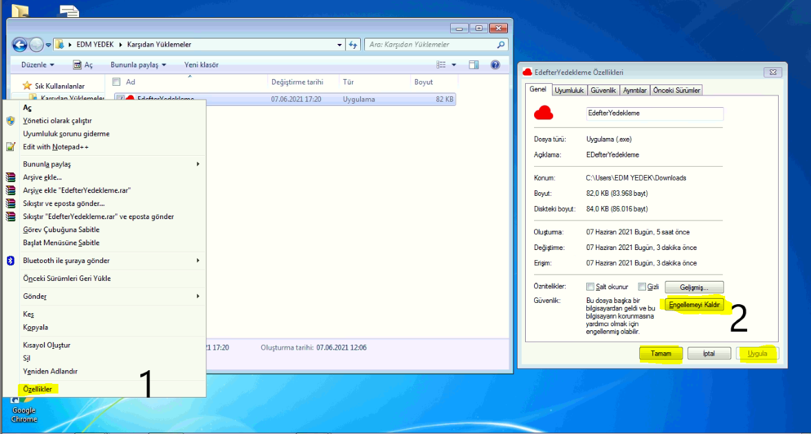 Gerekli izini indirmiş olduğunuz “EdefterYedekleme” kurulum klasörüne sağ tık yaparak Özellikler seçeneğine girip açılan pencerede “Engellemeyi Kaldır” butonuna basmanız sonrasında Uygula ve Tamam butonlarına basarak kaydınızı tamamlamanız gerekmektedir, işlemler için detaylı görsel aşağıda Resim2 de mevcuttur.