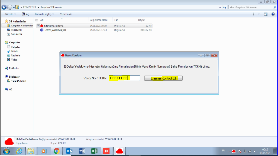Kurulum başladıktan sonra ekranda uygulama sizlerden EDM BİLİŞİM DANIŞMANLIK HİZMETLERİ A.Ş. sistemlerinde saklama hizmeti hakkı olan firmanızın VKN/TCKN bilgisini istemekte VKN/TCKN bilgisi girdikten sonra “Lisansı Kontrol Et” butonuna tıklayınız.